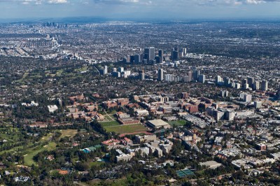 Looking across the UCLA campus from west to east. In the foreground is the residential area of campus.